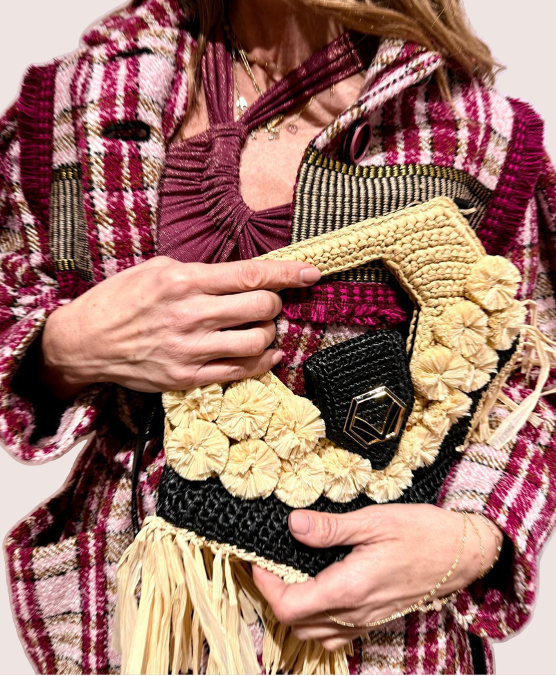 Woven raffia bag with floral details and fringes, featuring a handcrafted, summery feel. Comes with a removable strap, making it versatile and perfect for resort and casual chic looks.